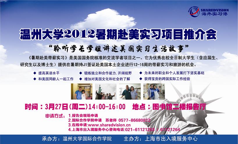 色情导航 2012暑期赴美实习项目报名会将在2012年3月27日(周二)下午13:30于图书馆二楼报告厅举行。欢迎各位同学届时前去咨询。