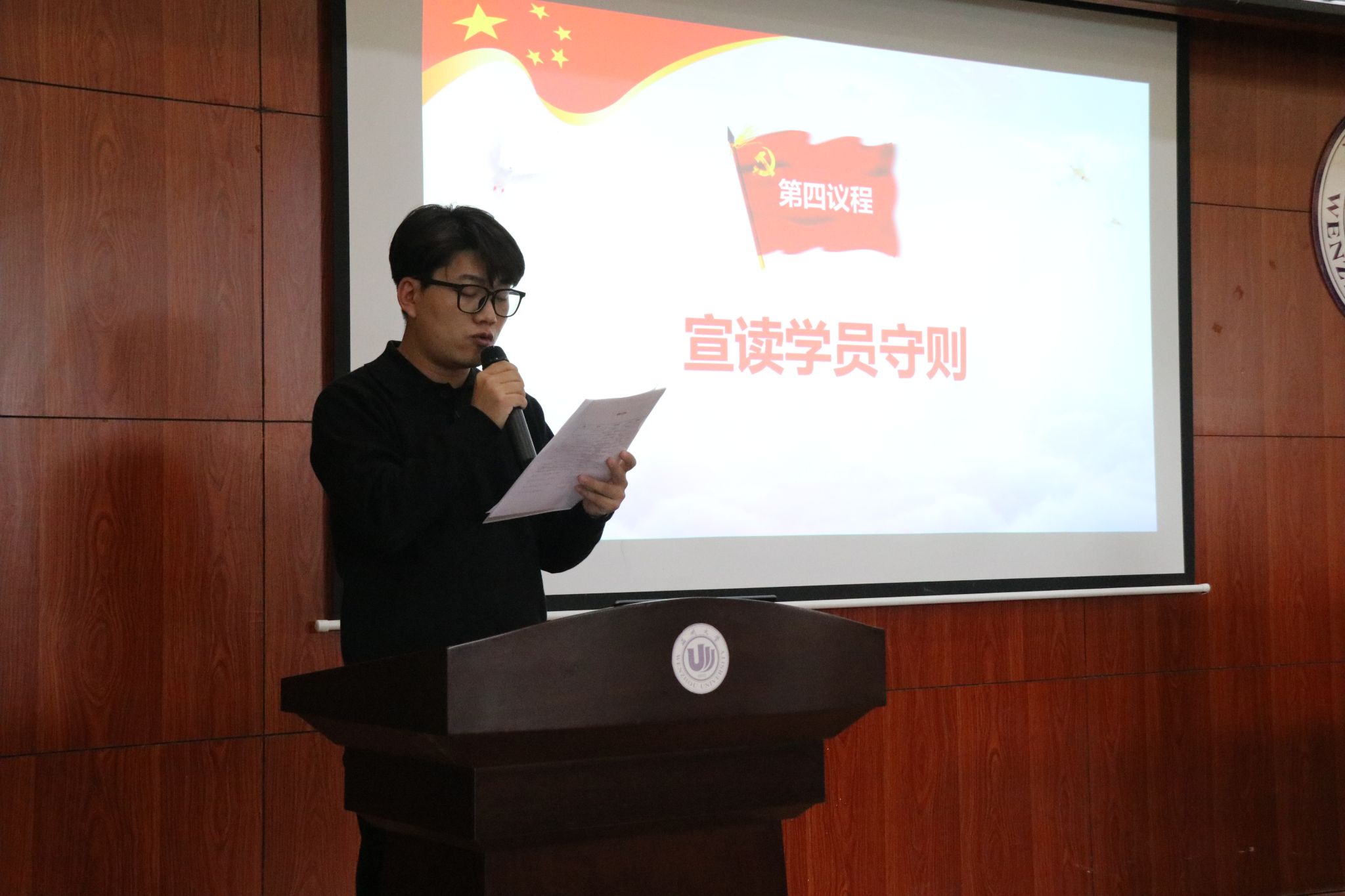 第四项议程,班主任曹建挺老师宣读《学员守则》。他强调了培训期间学员应秉持的基本态度与纪律意识,希望每位学员能够将此次培训视为提升自我政治素养与综合能力的重要契机,努力提升党性修养,在学习中成长,在实践中进步。