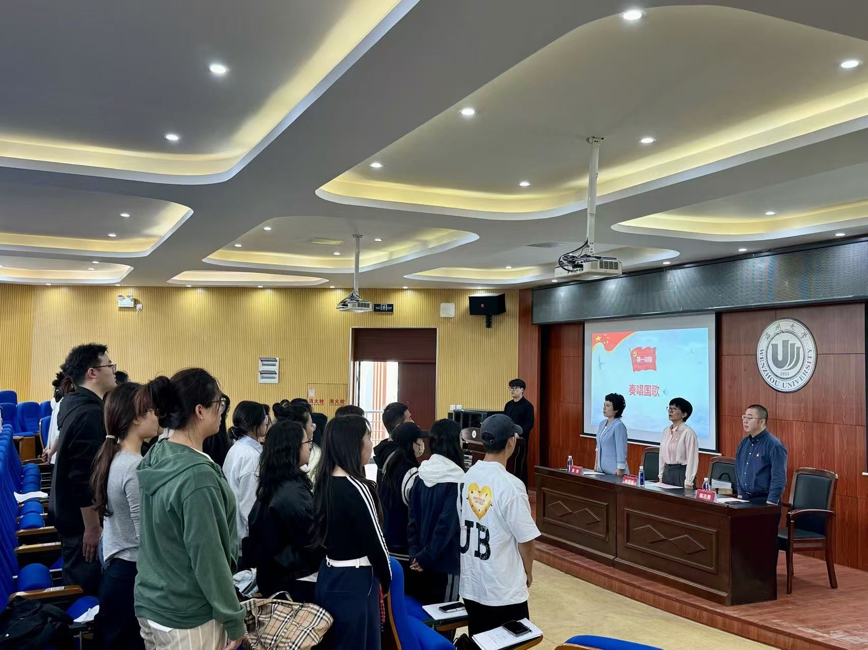 第一项议程,合唱国歌。在庄严肃穆的国歌声里,开班典礼正式拉开了帷幕。