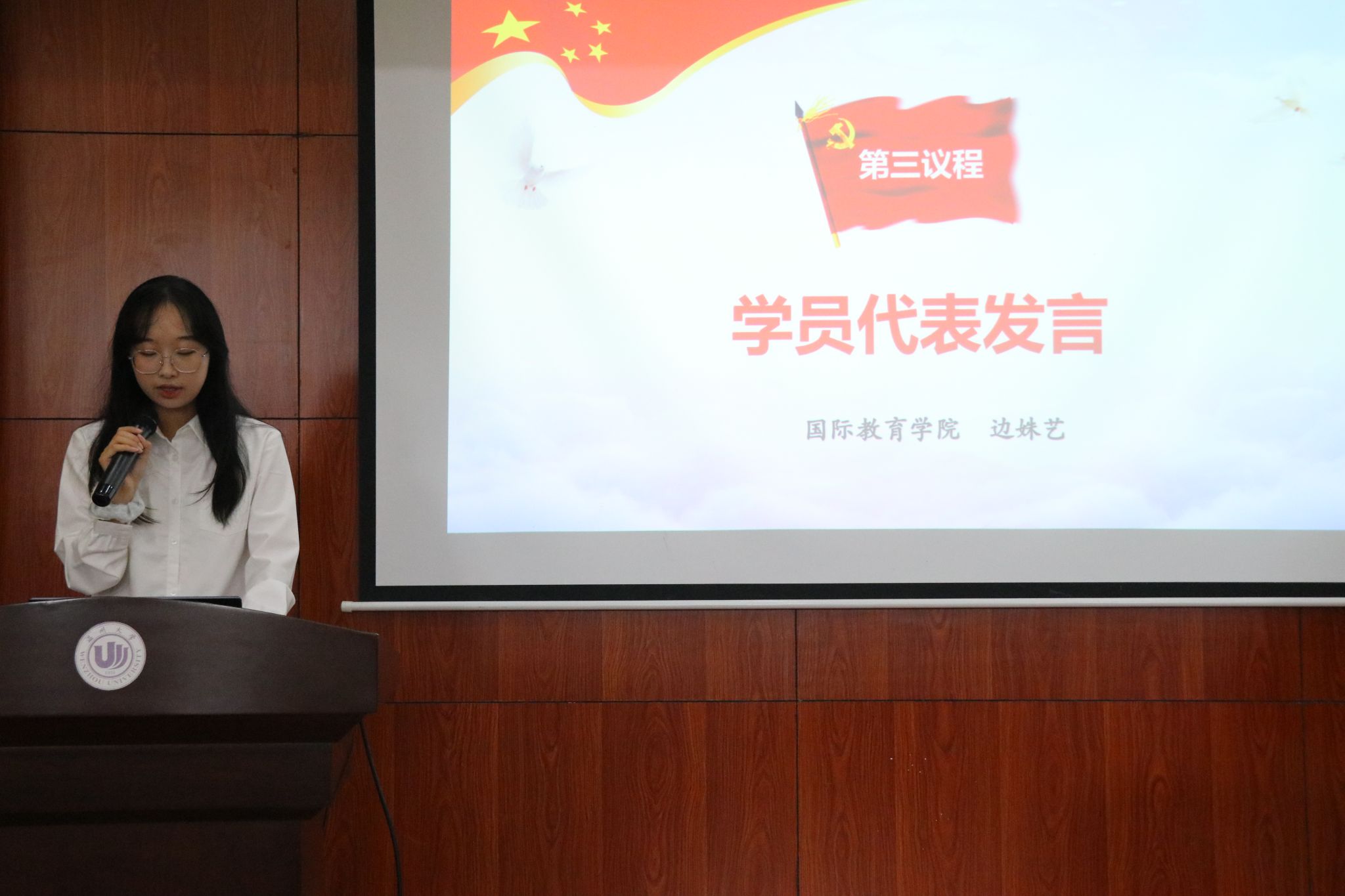 第三项议程,学生代表边姝艺发言。她呼吁全体学员要应当扛起新时代赋予的神圣使命,坚定理想信念,练就过硬本领,端正学习态度,深入思考并学深悟透此次培训班内容,将所学转化为实践,在大有可为的新时代里大有作为。