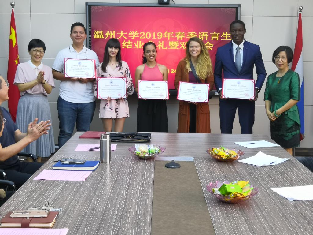 与会领导为结业学生颁发结业证书和学院纪念品,叶苗院长和林爱菊书记为来自意大利、美国、罗马尼亚等国的结业学生颁发校友联络员证书。叶苗院长在总结讲话中提到,希望各位结业学生在温大学有所得、学有所获,并能把学到的知识运用于实践,用中文给自己的家人、朋友、同学讲述在中国、在温大的故事,成为中国和各生源国家之间实现友好沟通和交流的桥梁。“在温大学习的知识、认识的人、经历的事都将会成为你们人生中一笔宝贵的财富,成为你们生命中美好的记忆”,她希望各位学生常回家看看,把自己的家人和朋友带到温大来,让温大的留学生教育事业越来越好。