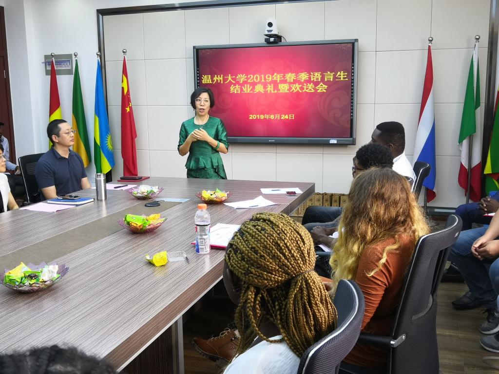 会上,王禄老师作为教师代表发言,她说一学期来已经和同学们从陌生人变成师生和朋友,感受到了他们的成长和汉语水平的提高,“学生们积极的学习状态一直感染着我,督促我更加深入地准备教学内容,我最快乐的事情,就是和学生们一起成长。”她希望结业语言生们常和老师保持联系,及时分享好消息。罗马尼亚籍学生曼德琳和喀麦隆籍学生董琪琛作为结业学生代表发言,他们用中文讲述了在温大学习生活的切身感受。“我们将会把‘求学问是,敢为人先’的校训精神铭记在心”,曼德琳说道。董琪琛对温大老师的责任心、爱心颇有感触,他说:“每当感到很累的时候,一想到负责的老师们,我就努力完成作业,而且要完成得比老师们希望的更多更好,因为我不想让他们失望,希望大家也尊重老师的点滴付出。”他说将来自己还会去更多的国家,遇到更多的人,但是永远也不会忘记在这里学过的知识,不会忘记温大的老师们。