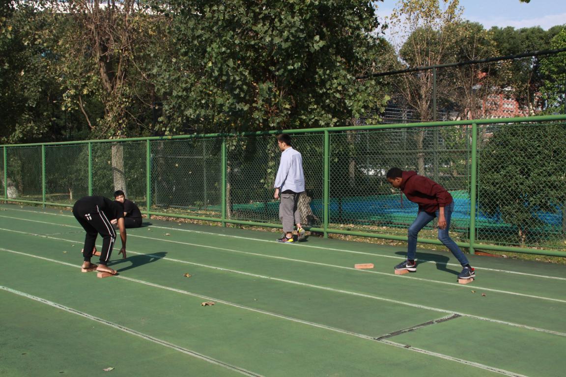 趣味运动会分四个项目:趾压板木头人,摸石过河,趣味前进射球赛和毛毛虫竞速。其中摸石过河和毛毛虫竞速最为有趣,师生们两人一组,每位参赛者脚底放置两块砖头,参赛选手听到裁判员发出“开始”口令后开始行动,提起左脚并拿起砖头放置前方,随后右脚提起并将右脚下砖头放置前方,如此往复,用时最短的一组获胜,师生们都纷纷铆足了劲往前冲。在毛毛虫竞速环节,中外学生和老师们一起合作,骑在毛毛虫上从足球场一端移动到另一端绕过障碍物后返回,用时最短一组获胜。