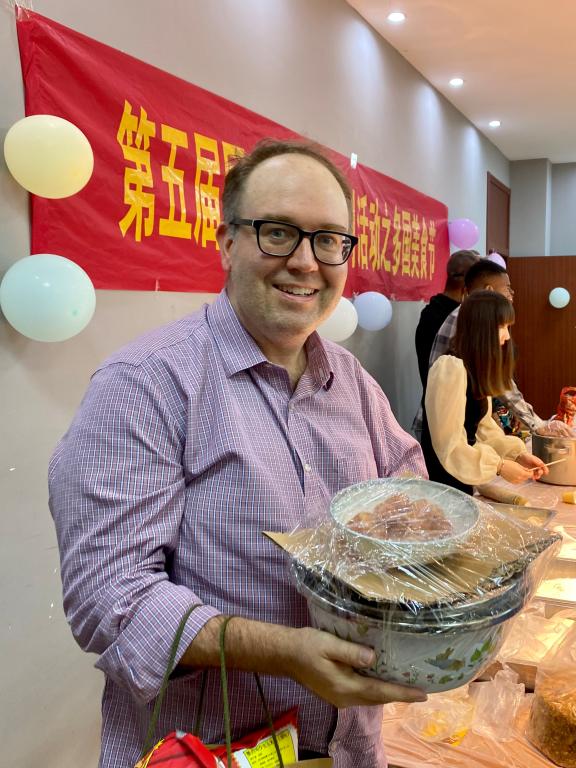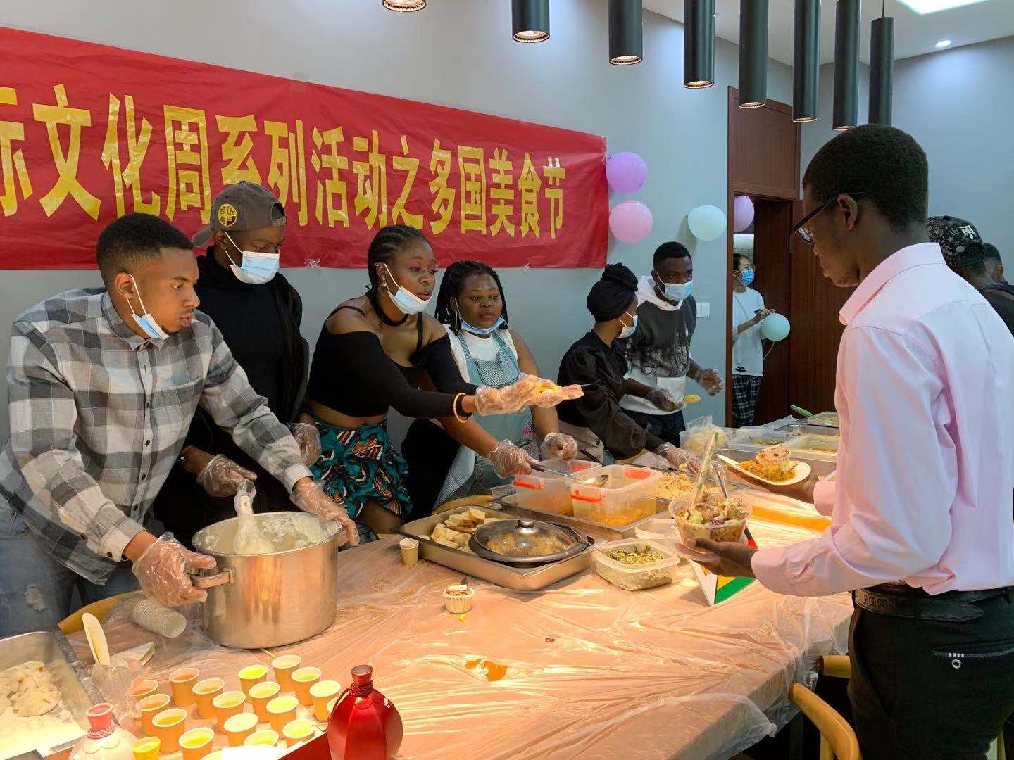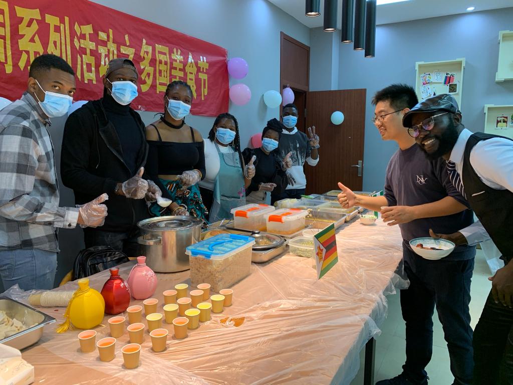 活动现场有来自中外多国的多种菜品,如饺子、意大利面、韩式拌饭、日本寿司、美式薯条、芝士通心粉等品类丰富的食物供师生选择。并且,今年还有来自津巴布韦、尼日利亚、赞比亚等国的6名国际学生奉上自己国家的特色美食,他们自己亲手选材制作,并在美食节上分享给所有中外师生。来自津巴布韦的MASHIRI REJOICE SHYLINE同学说,“温大有来自不同国家的老师和学生,我想在今天利用这个机会向他们展示我们津巴布韦的美食,让他们尝一尝来自津巴布韦食物的味道。同时我也有此机会品尝来自尼日利亚等不同国家的食物,这让我感觉就像在家里一样。所以我觉得这是一个很好的活动,我很开心,我希望学校能继续举办这样的活动,让我们思乡的心情有所缓解。”来自美国的外教TRENTON GLORE也主动提出想要分享美国的特色食物,他在自己家制作好之后专门带到美食节活动现场分享他的手艺,他说自己很想把在美国最受欢迎的美食分享给大家,让大家常常“幸福的”味道。