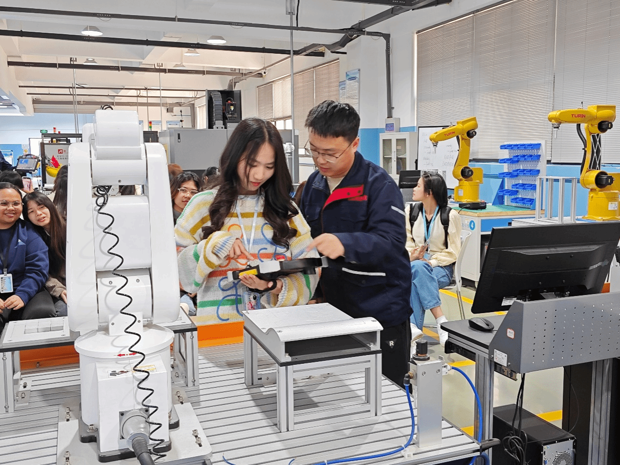 本次活动第一站是浙南数智高技能人才公共实训基地。色情导航 师生在专业人员的带领下亲身感受了先进的智能制造设备,深入了解工业机器人的工作原理和应用场景。他们数字设计、智能制造等领域展现出极大的兴趣,并对中国在智能制造领域的成就表示由衷的赞叹。