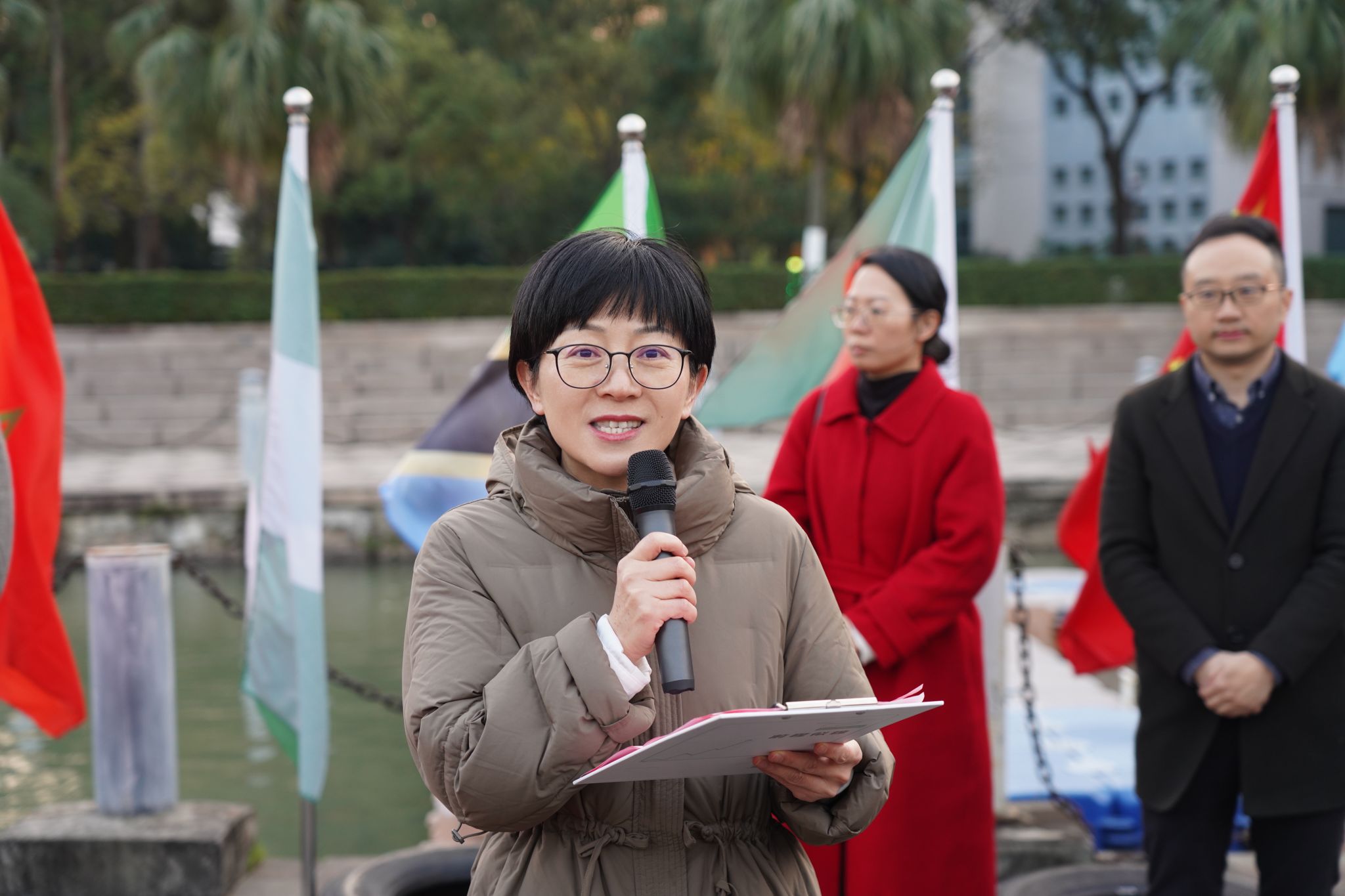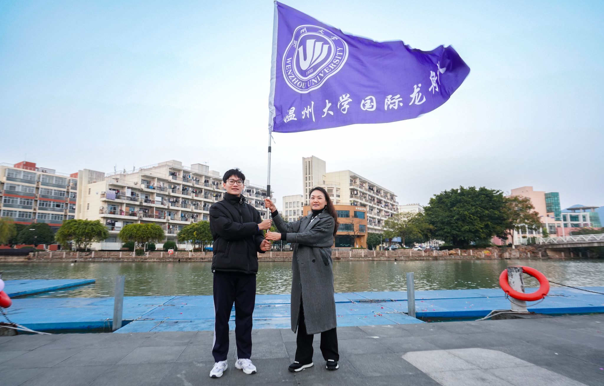 体育与健康学院副书记李丽为国际龙舟队队长罗文达授旗。“划龙舟是一项非常有趣的活动,作为国际龙舟队的队长,我一定会肩负起这个责任,带领队员们认真训练,让每一次划桨都充满力量与激情,让更多人领略到中华龙舟文化的独特魅力”,来自越南的留学生罗文达接过手中的旗帜,激动地说道。