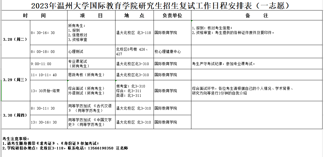 2023年研究生招生专业目录》,线下复试的专业课考核为笔试,时间为2小时,满分100分。如调剂⽣的复试笔试科⽬与我校初试科⽬相同,由学院另⾏确定复试笔试科⽬。 (3)综合素质与能力考核环节,采取以考官提问、考生回答的方式进行。主要考核考生的基本技能、综合运用能力、创新能力等,并结合大学学习成绩单、毕业论文、科研成果等补充材料,加强对考生既往学业、一贯表现、科研能力、综合素质等情况的全面考查。按优(95分)、良(85分)、中(75分)、及格(65分)、不及格(35分)五级评分计分。复试小组成员对每个复试考生当场独立打出成绩,去掉1个最高分和1个最低分,其他成绩平均后作为该考生的复试成绩(百分制,保留两位小数),占复试总成绩的60%。学院对综合素质与能力面试能力考核成绩记为不及格的考生,应写出详尽评语。 (4)外语听力及口语的测试环节,根据《温州⼤学研究⽣招⽣复试中外语听⼒及口语测试实施⽅案》,对每位考⽣单独进⾏听⼒及口语测试,当场给出测试成绩,考⽣最后得分为该测试小组所有考官给定成绩的平均分。外语听⼒口语测试满分10分,直接进入复试成绩。